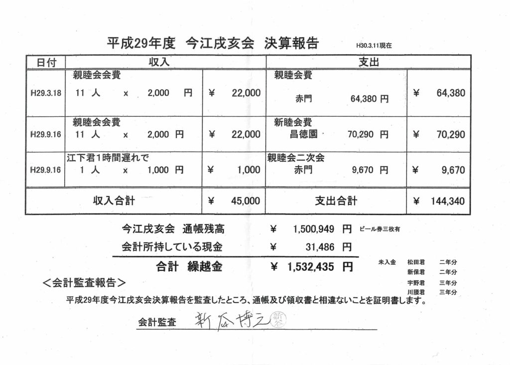 ・H29/3/18 決算・親睦会費 22,000円(11名)